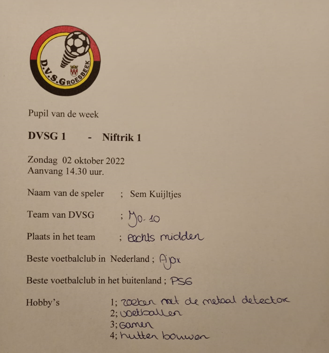 ArchiefPupil van de Week Sem Kuijltjesupdated on 10 oktober 20224 oktober 2022 Tijdens de laatste wedstrijd van ons eerste elftal tegen Niftrik was Sem Kuijltjes Pupil van de Week.